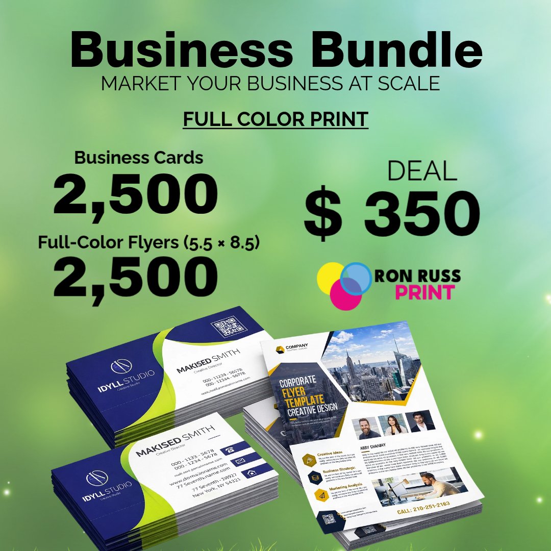 Get 2500 Flyers 5.5 x 8.5 inches single side and 2500 Business Card 3.5 x 2 inches Deals double side print.